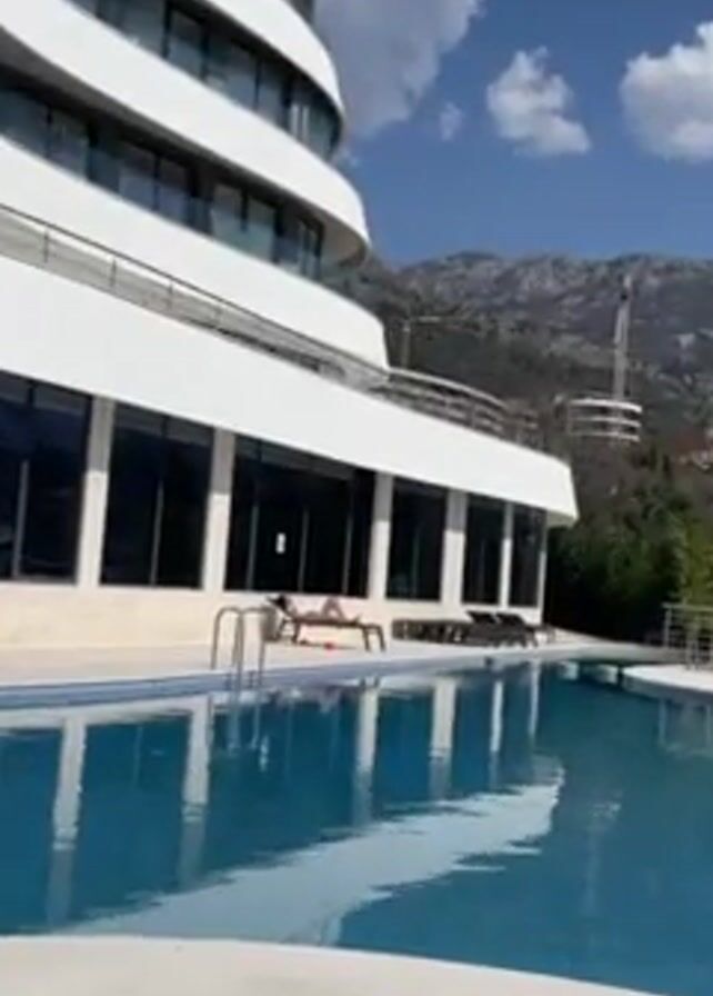 n outdoor swimming pool next to a modern white building, possibly a hotel or resort, under a bright, partly cloudy sky. The pool's water is clear and blue, reflecting the sky and building. A woman is lying on a sun lounger by the pool, seemingly sunbathing. Other empty sun loungers are nearby. In the background, a mountain range is visible, along with a construction crane. The shot is steady, providing a clear view of the scene.