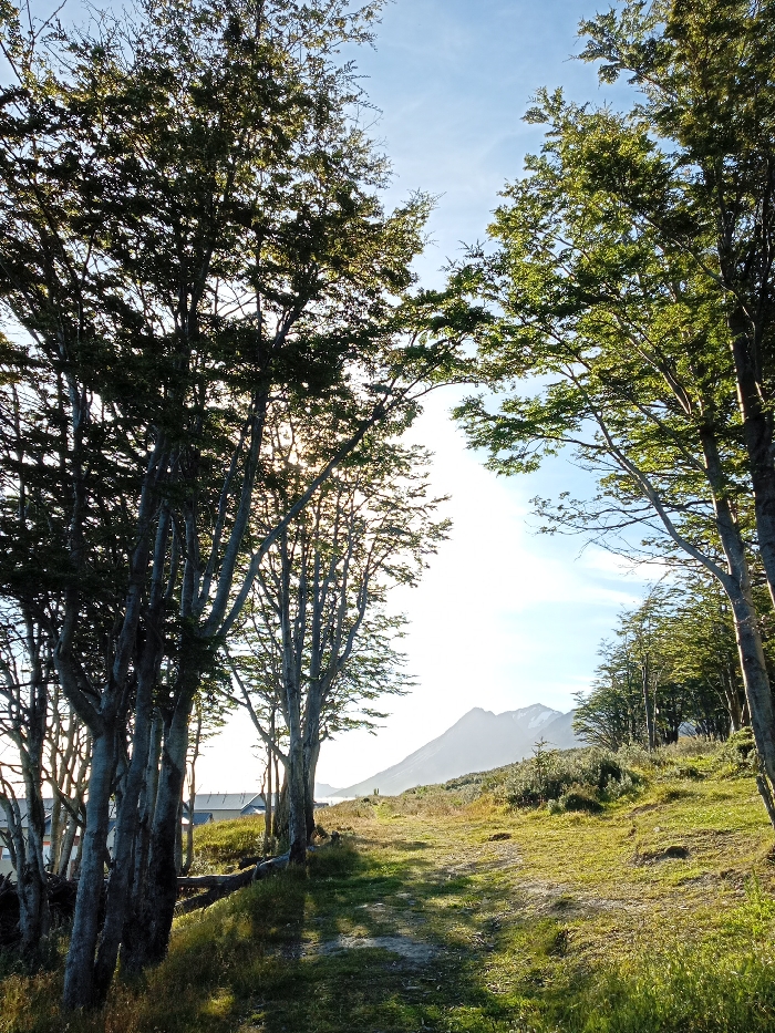 A sunlit path meanders uphill through a forest. Tall, slender trees with dense canopies frame the view, creating a natural tunnel effect. The path is grassy and partially shaded. In the distance, a mountain peak is visible against a pale sky. The scene evokes a sense of tranquility and exploration. Some buildings can be seen through the trees.