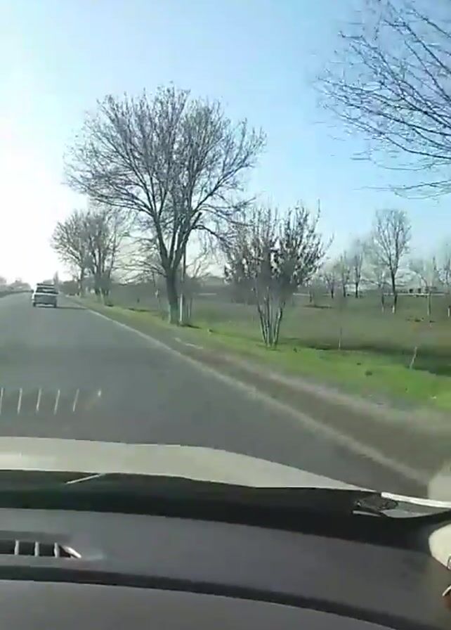 view from inside a car driving along a road. The road is a two-lane road with a white line dividing the lanes. There are trees along the side of the road, and a grassy field. The trees are bare. There is a car in the distance. The sky is blue. There is the sound of a person speaking, but the speech is muffled.