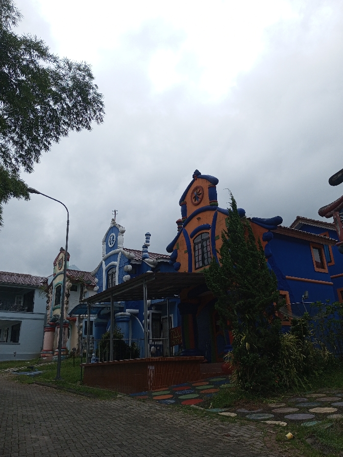 Whimsical buildings with quirky architecture line a cobblestone path. Structures feature vibrant color schemes, including orange, blue, and white, with eclectic design elements like rounded roofs and decorative embellishments. A street lamp stands to the left, partially obscured by tree branches. Overcast skies create a muted backdrop for the scene. The overall impression is playful and imaginative.