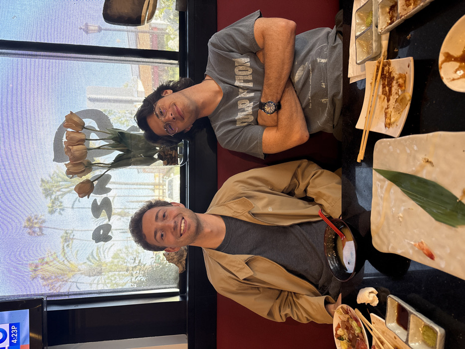 Two adult males are seated at a dark, reflective table inside a restaurant, identified as Asahi Sushi & Roll at 2307 Pacific Coast Hwy, Lomita, California, based on the prominent "ASAHI" text visible through the window