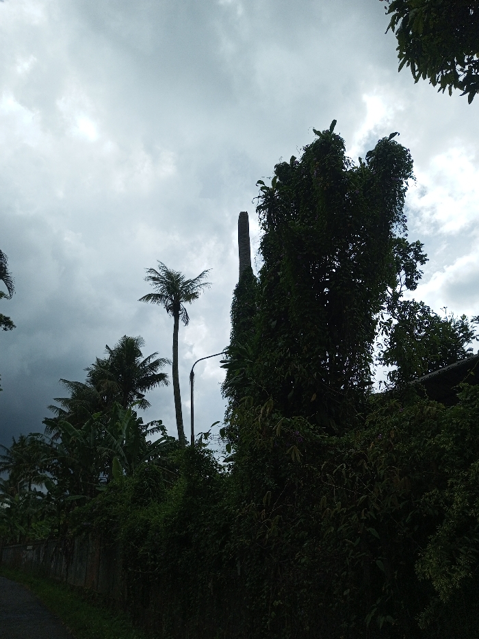 The image depicts an outdoor scene in Ganja City, Azerbaijan, dominated by dense vegetation under a heavily overcast sky. Dark grey clouds fill the upper frame, with a visible shift to darker, potentially stormier clouds towards the left. A narrow, dark asphalt path or road is visible in the lower-left quadrant, running alongside a low, partially overgrown concrete or stone wall. Multiple trees comprise the primary subjects. Several tall palm trees with visible fronds are scattered across the left and central midground. One particularly tall and slender palm tree stands prominently in the center-left. To its right, a large, densely foliated tree occupies the right side of the frame, heavily covered in vines and other epiphytic growth, obscuring its underlying structure. Behind the central palm tree and to the left of the large overgrown tree, a tall, slender, dark, vertical structure is visible, consistent with a denuded palm trunk or a broken wooden pole, exhibiting an irregular top edge. A street light pole with a curved arm is situated between the central palm and the large overgrown tree. No individuals, animals, or vehicles are present. The scene is static, captured under diffuse, low-light conditions consistent with heavy cloud cover.