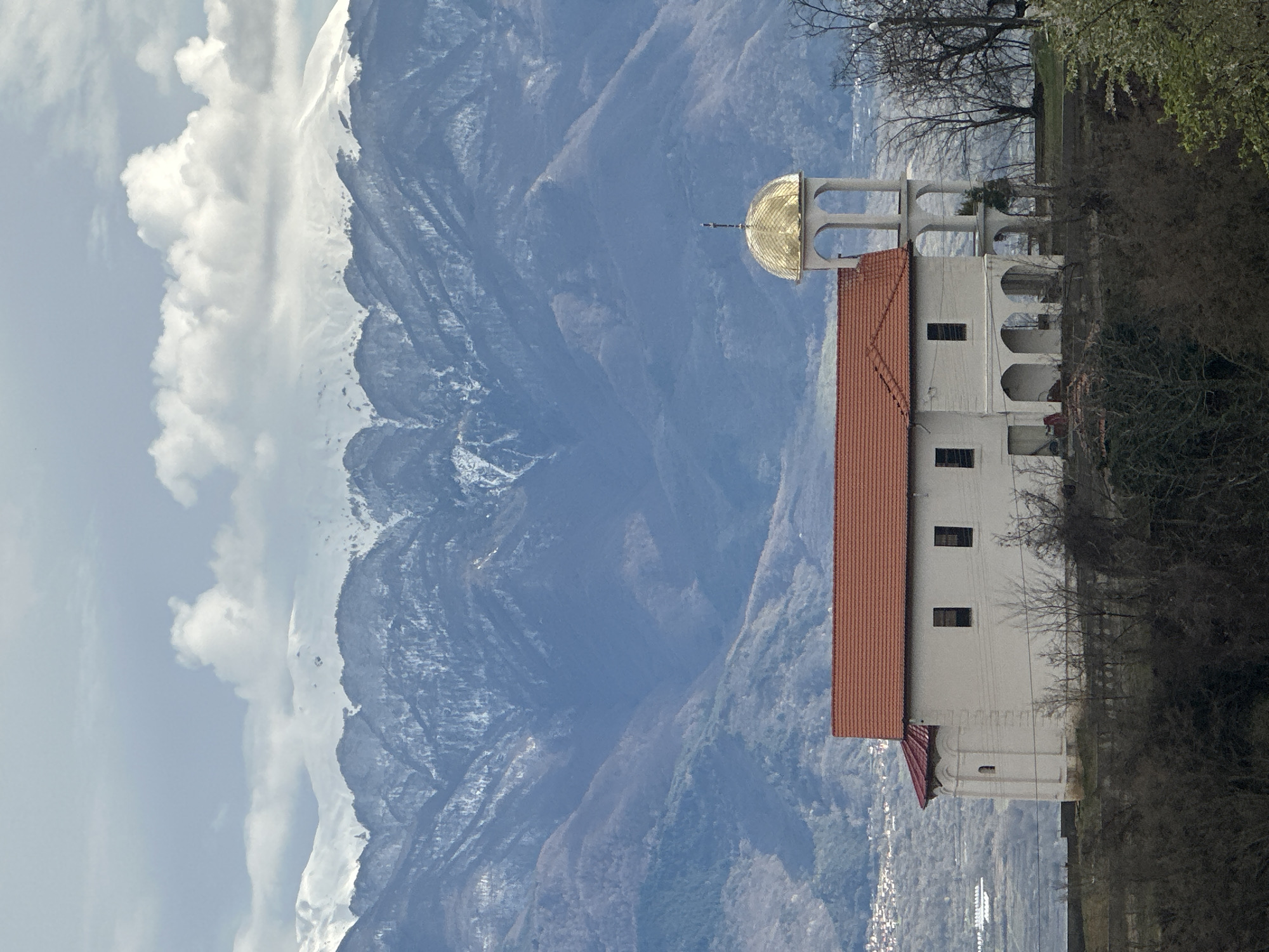 A white-walled building with a terracotta-tiled roof, identified as a church or monastery, stands prominently on a hillside in Churicheni, Bulgaria. The structure features a main rectangular section with several dark-framed windows. To its right, a multi-tiered bell tower-like extension rises, composed of white arched openings, culminating in a spherical golden dome topped with a cross. The lower visible section of the building includes additional archways. The foreground consists of dark, bare deciduous trees and dense shrubbery on a sloping terrain. In the mid-ground, a broad valley is visible with a distant settlement. The background is dominated by a substantial mountain range with snow-capped peaks. The lower slopes of the mountains show varying densities of bare or sparse vegetation, rendered in blue and grey tones due to atmospheric perspective. The sky is partly cloudy, with scattered white cumulus clouds. No people or specific actions are discernible.