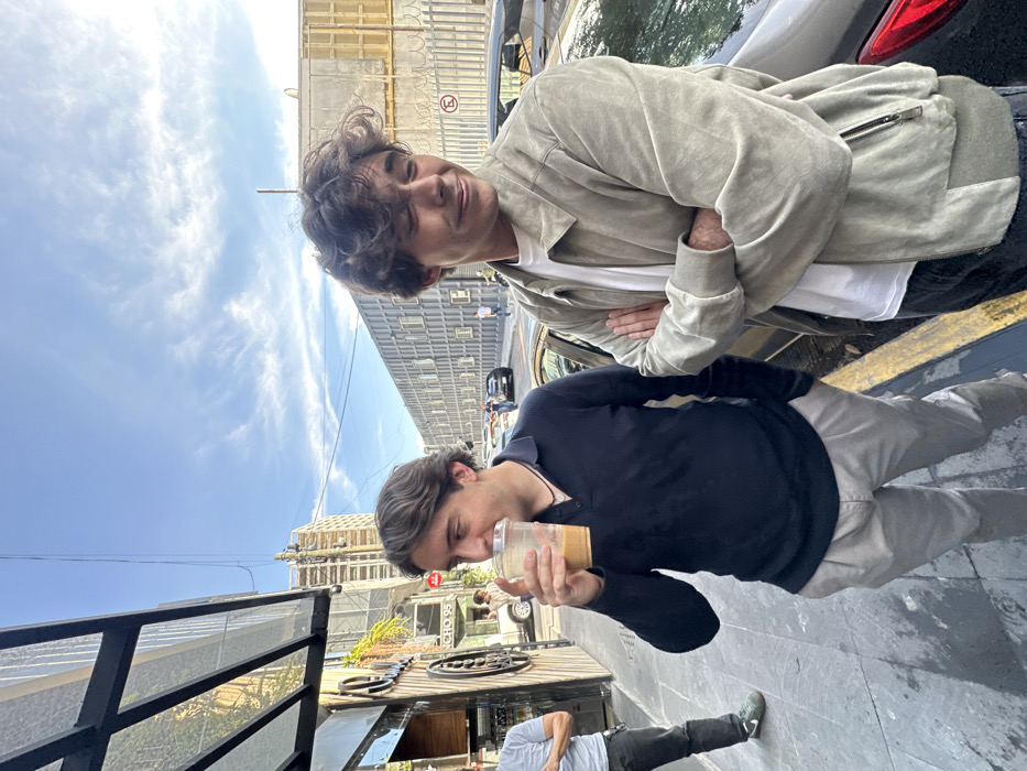Two young men pose for a photo outdoors. One, wearing a light jacket and white t-shirt, stands beside a car with arms crossed. The other, dressed in a dark collared shirt and light pants, holds a drink in his hand. A building with multiple windows is visible in the background, with cars parked along the street. A partial view of the sky with scattered clouds is visible in the upper left corner of the picture. A third person is seen in the bottom of the frame.