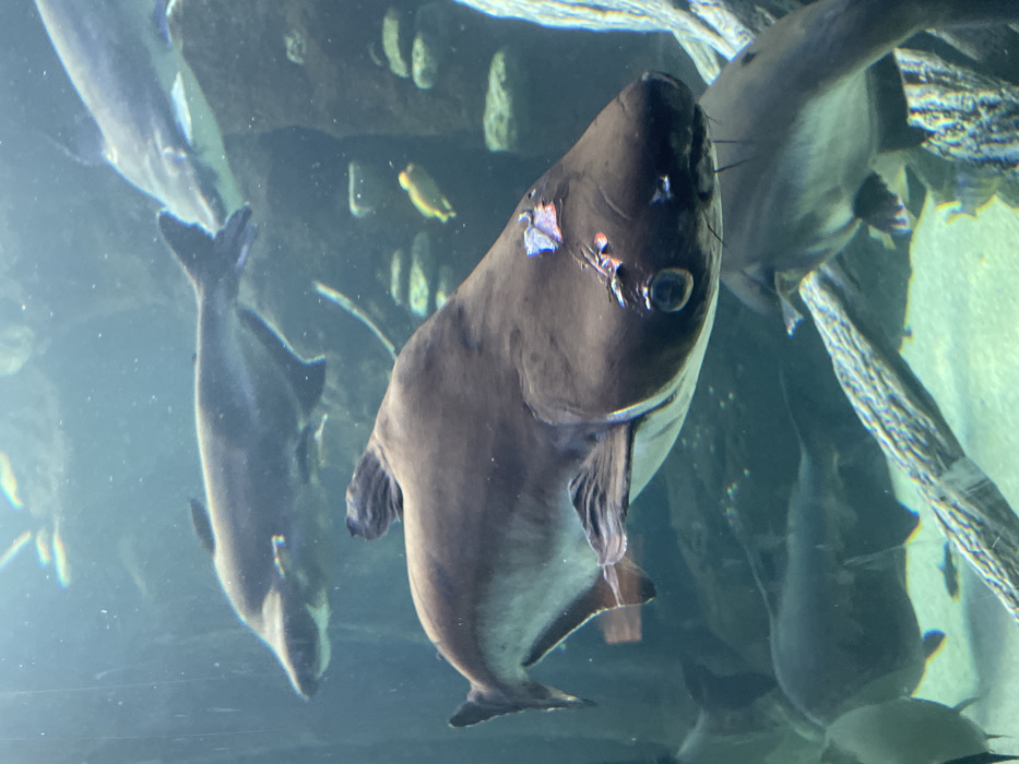 This image depicts an underwater scene within an aquarium in the city of Les Meravelles, Spain. The foreground features a large, dark-bodied freshwater fish, likely a type of pangasius catfish, swimming slightly towards the right and viewer. This fish presents a distinct injury or lesion on its head, located above and slightly forward of its right eye, manifesting as a pinkish-white epidermal abrasion with reddish highlights. Its body is dark grey-brown dorsally, fading to a lighter tone ventrally. Several other fish of the same species are visible in the midground and background, swimming at various orientations. A solitary small, yellowish fish is present in the mid-right background. The submerged environment includes rock formations and a gnarled piece of driftwood or root structure in the lower right. The water appears clear, showing minor particulates, under diffused lighting conditions. No human subjects are present.