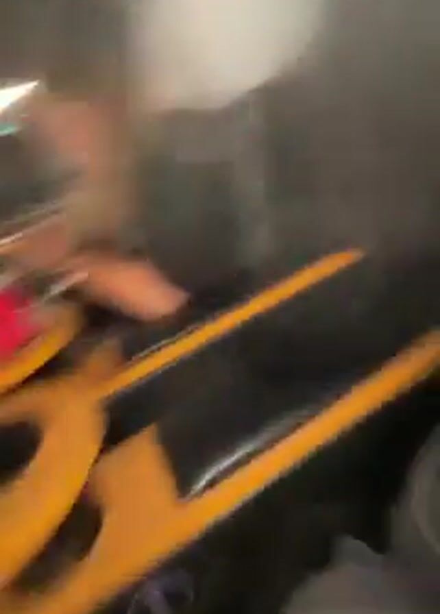 A first-person perspective video shows a person reclining in a movie theater seat, their legs stretched out towards the screen