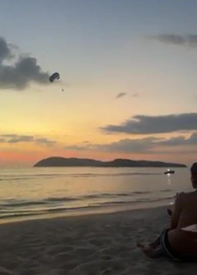 beach scene at dusk. A person sits in a chair on the sand, facing the ocean. There's a small wooden table beside them. In the distance, there is an island silhouetted against the orange and yellow sunset. Above the water, a parasail is visible with a person suspended below. A boat is also visible on the water. The sky is filled with clouds, and the waves are gently lapping on the shore.