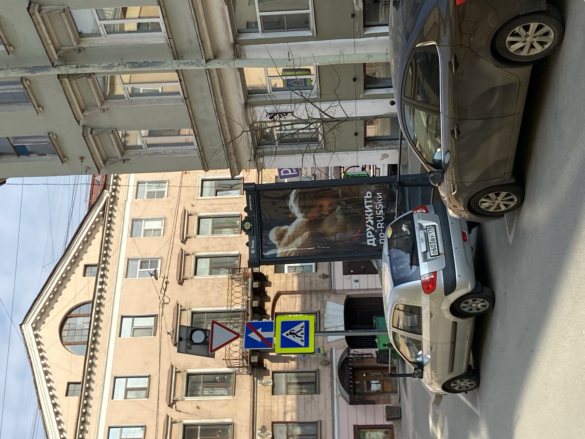 The image depicts a street scene in Saint Petersburg, Russia