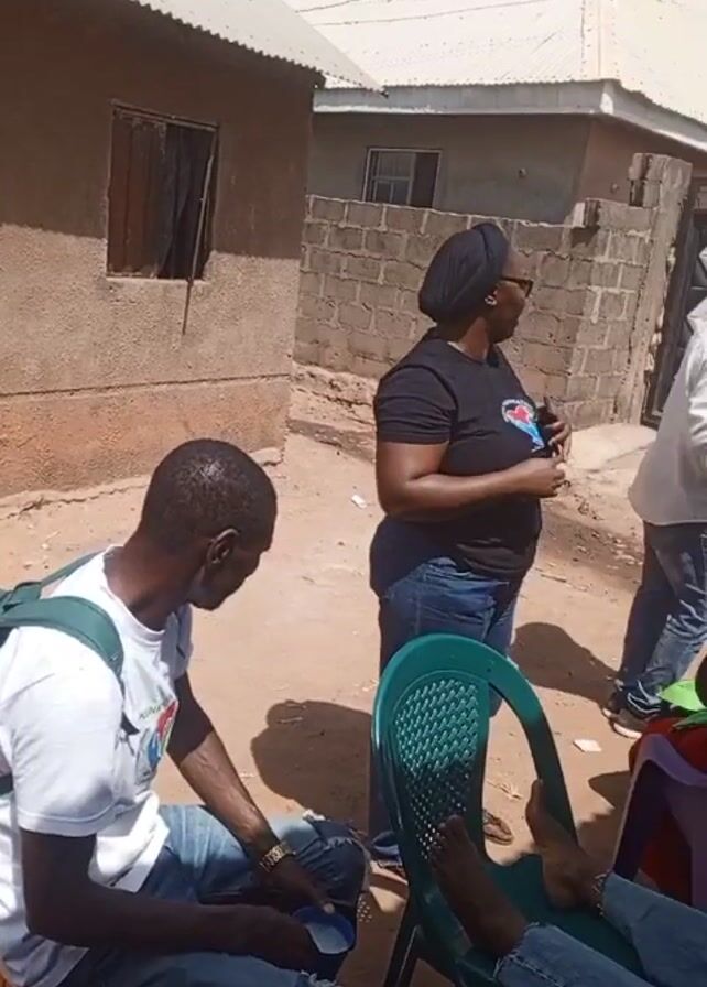 group of about a dozen people gathered in an outdoor area that seems to be between houses in a residential area. They are sitting on plastic chairs, some eating from plates, and chatting. A woman in a black shirt and head covering is standing and talking, apparently addressing the group. A man in a white shirt is standing nearby and appears to be part of the conversation. The houses are simple, one with a corrugated metal roof. There is a brick wall and gate visible in the background. The ground is mostly dirt. The weather looks sunny and bright. A man sitting in the foreground wears a backpack.