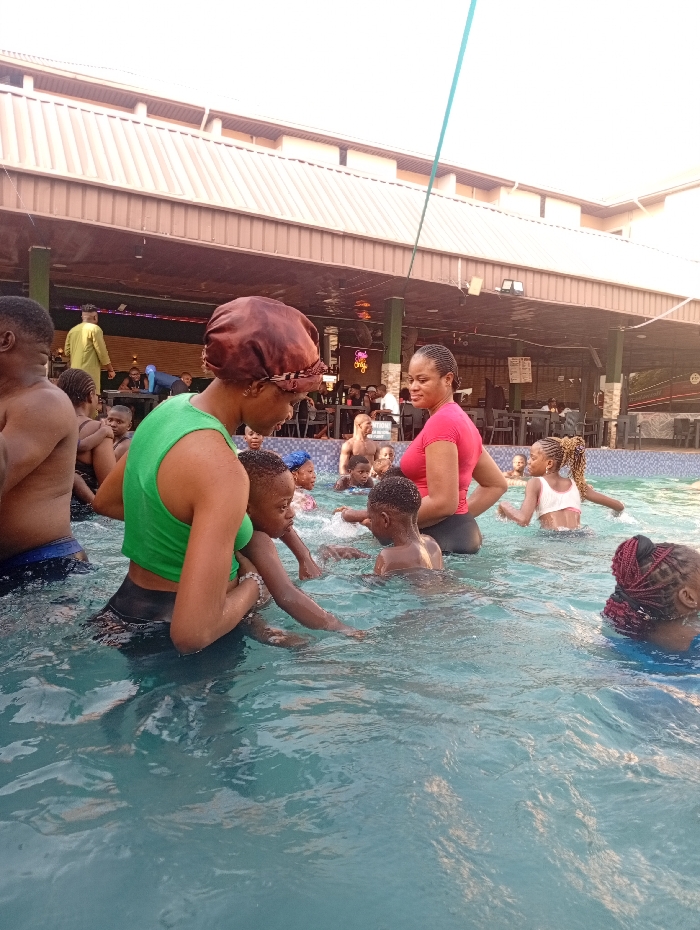 People are swimming in a pool under a covered area. A woman in a pink shirt is standing and watches the group. Another woman wearing a green top and a brown head covering is holding a small child. The building is visible in the background.