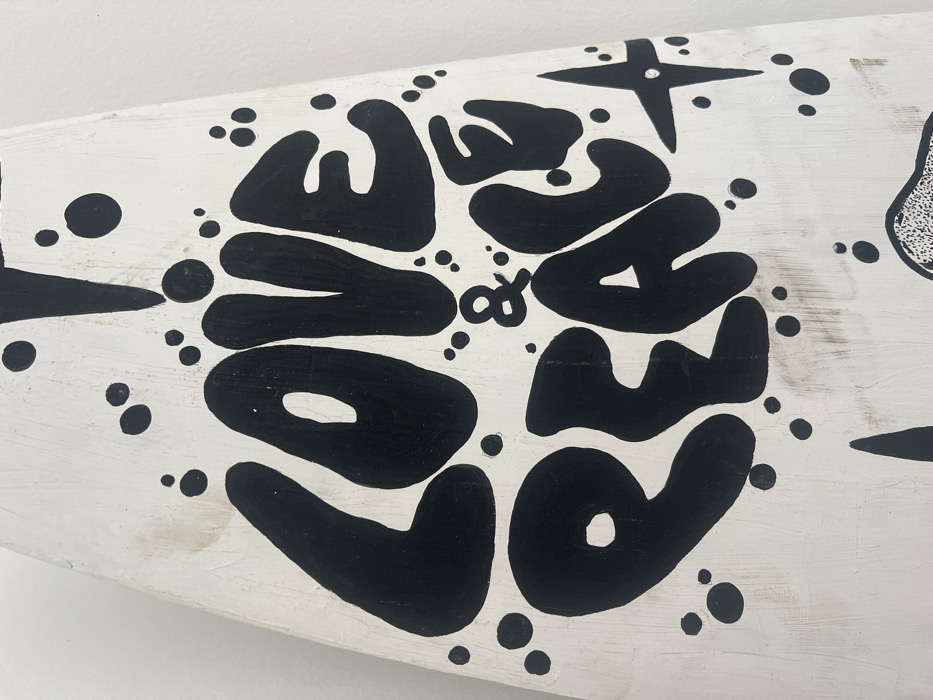 A vertically oriented white object, potentially a weathered wooden panel or surfboard, is presented, bearing black graffiti-style artwork
