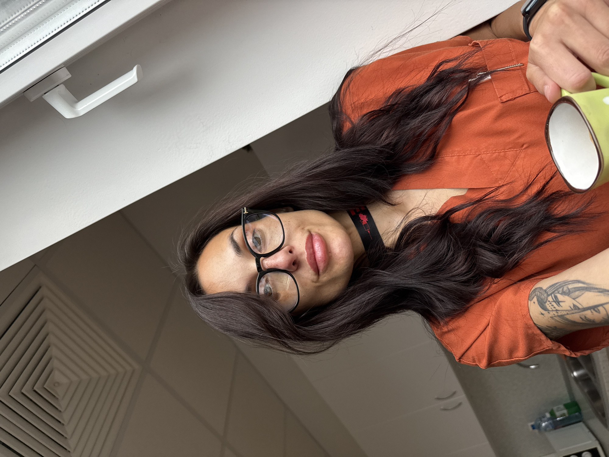 A woman with long dark hair is indoors, wearing black-rimmed glasses and an orange collared shirt