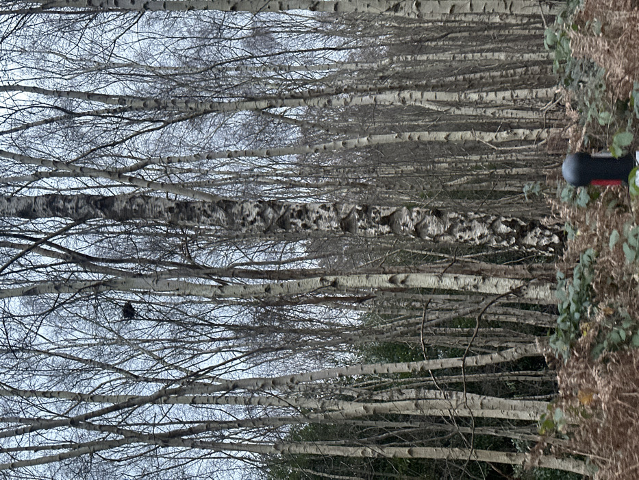 The image displays a dense woodland scene in Tunbridge Wells, United Kingdom, during late autumn or winter under an overcast sky. The foreground and mid-ground are dominated by numerous bare deciduous trees, primarily identifiable as Silver Birch (Betula pendula) due to their light-colored bark marked with darker fissures and patterns. A prominent birch tree with pronounced dark bark markings stands slightly right of the center. High in a birch tree towards the left-center, a large, dark bird's nest is visible among the leafless branches. The ground is covered with dried, reddish-brown bracken and patches of dark green evergreen ground cover. In the lower right corner, a black and white (or red and white) roadside marker is partially visible, obscured by the undergrowth, indicating adjacency to a road or path. No individuals, other than the implied bird that built the nest, are present, and no actions or interactions are depicted.