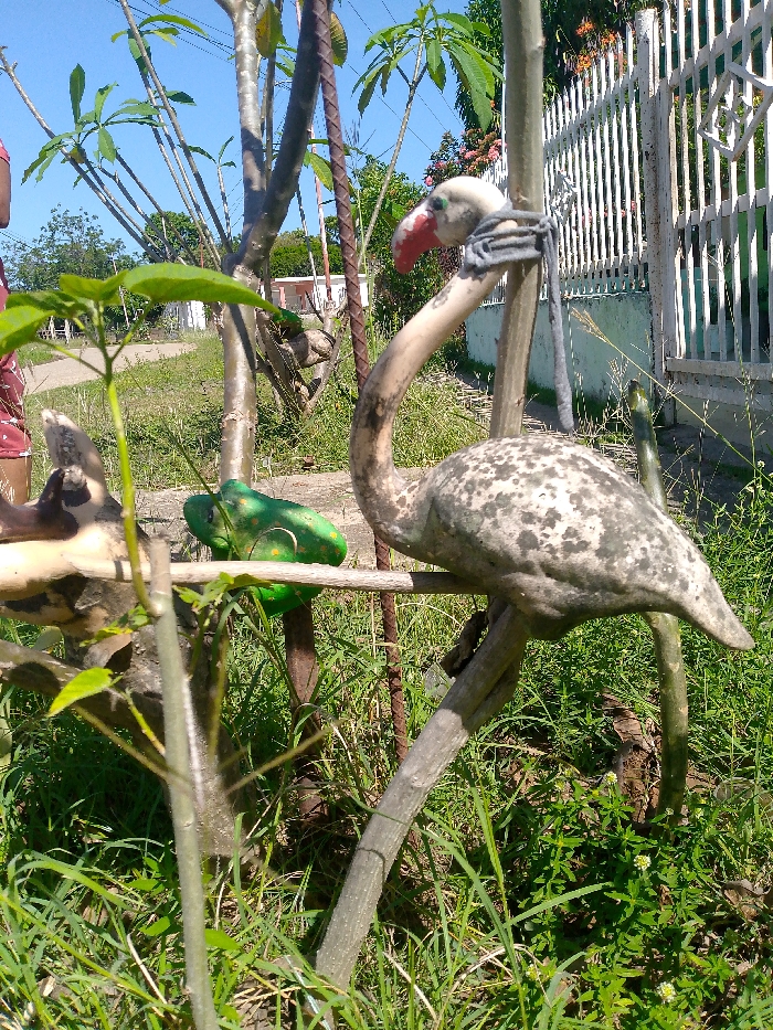 A weathered, speckled flamingo lawn ornament stands amidst greenery. Its neck is secured to a tree branch with grey cloth. A green frog ornament sits to the left. Lush grass and a young plant surround the arrangement. A white picket fence is visible in the background under a clear, blue sky. Part of a person wearing a red top is visible on the left. The scene is bathed in sunlight.