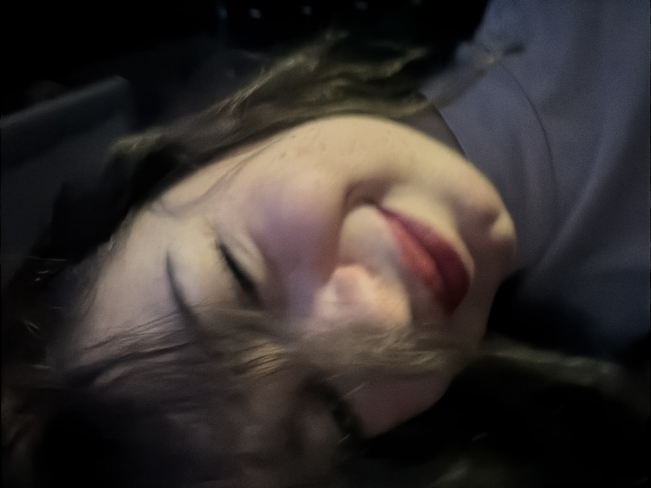 A close-up, slightly blurred shot depicts a person with fair skin, dark hair, and freckles. Their eyes are closed, and they have red lipstick on. They are lying down against a dark surface. The angle is canted, making the person appear sideways. A light grey fabric is visible behind the head. The lighting is dim and unclear, with some dark shadowed areas, resulting in a somewhat obscured image.