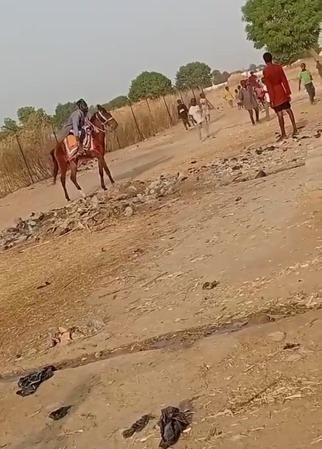 person riding a brown horse on a dirt path. There are people standing and walking around, watching the horse and rider. The environment looks like a rural area, with trees and a makeshift fence in the background. The ground is dry and dusty with some scattered debris. The sky is overcast.