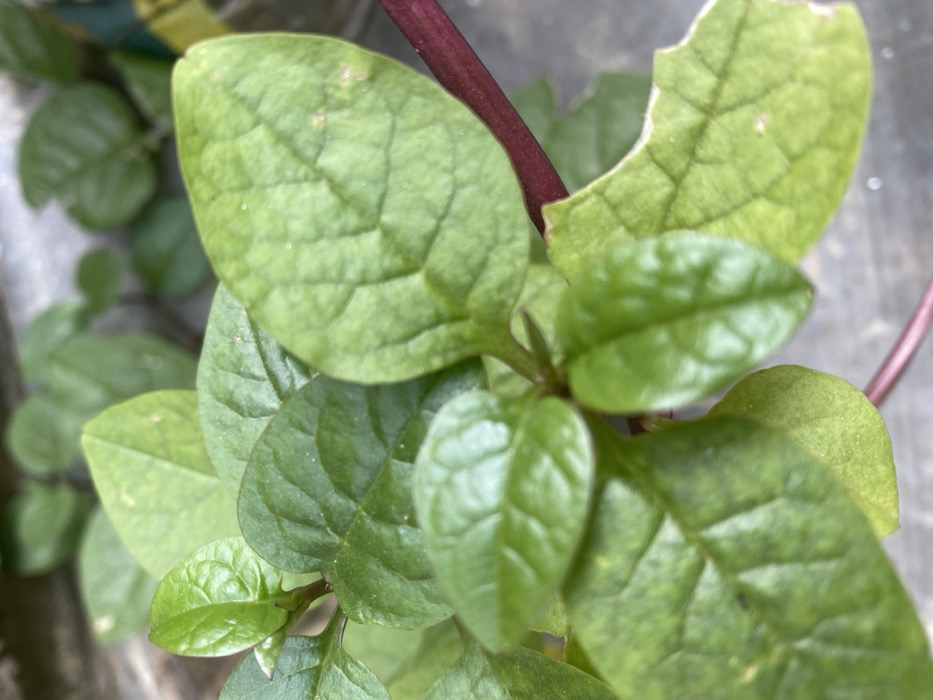 The image presents a close-up, top-down view of a plant located in Kugbo, Nigeria. The primary subjects are numerous green, ovate leaves with distinct venation, displaying various shades of green from bright, vibrant new growth to a slightly duller hue on mature leaves. A prominent reddish-purple stem is visible, particularly extending diagonally across the right side of the frame. Several leaves exhibit minor surface imperfections, including small light brown spots. One leaf in the lower right quadrant shows an irregular, jagged edge, indicative of damage or consumption. The background is out of focus, appearing as a blurred, light grey, textured surface, consistent with concrete or similar paving material. No individuals, explicit actions, or direct interactions are visible.
