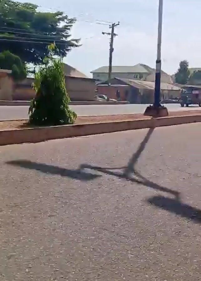 street scene in a sunny, urban environment. The camera is positioned on a side of the road, facing a main street with a median. Several people are seen walking on the sidewalk or near the edge of the road. Motorized tricycle taxis are seen driving on the street. Buildings are seen across the street in the background, including a green-roofed building. Power lines are visible overhead, and trees and other foliage are present in the scene.