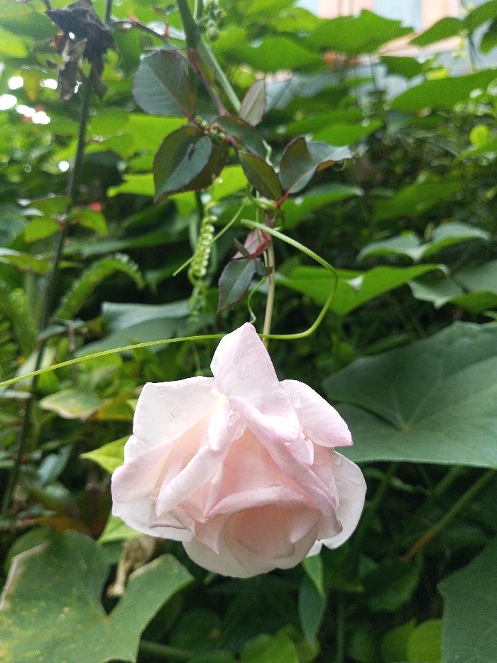 A single, partially open, light pink rose bloom is centrally positioned in the foreground, hanging slightly downwards. Small water droplets are visible on its petals. Directly behind and above the rose are stems with darker green leaves. A thin, light green tendril is visible, curling among this foliage. The background consists of dense, out-of-focus green leaves and vegetation, indicating a lush natural environment. No individuals, animals, or artificial structures are present. The scene is located in Vaatharawattai, Sri Lanka.
