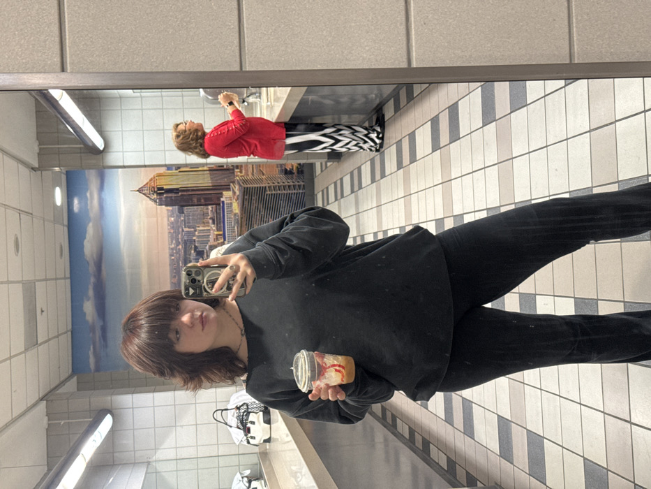 This image depicts the interior of a public restroom. The location is identifiable by a large mural on the back wall featuring the skyline of Atlanta, Georgia, United States, specifically including the distinct Bank of America Plaza building. The scene is a mirror selfie. In the foreground, occupying the majority of the left side of the frame, is a young Caucasian female with medium-length dark brown hair, styled with bangs and layers. She is wearing a dark, possibly black, long-sleeved top and dark flared pants. She holds a clear plastic cup containing a beverage in her right hand. Her left hand holds a smartphone, positioned to capture her reflection in the mirror. A ring is visible on her left ring finger. Reflected in the mirror to the right, in the mid-ground, stands an older Caucasian female with reddish-brown curly hair and glasses. She is wearing a bright red long-sleeved top and black and white vertically striped pants. She is positioned at a sink, with her hands near the faucet, suggesting the action of washing or drying. The restroom features light grey square wall tiles and a floor composed of alternating light and dark rectangular tiles arranged in a striped pattern. A long, light-colored counter with sinks extends along the left wall, where a white and black handbag is visible. Fluorescent lighting fixtures are present on the ceiling.