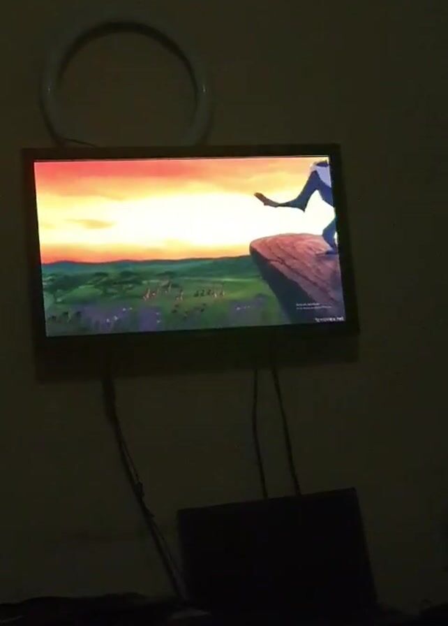 A TV is mounted on a wall. The TV is playing a scene from The Lion King. A laptop is on a desk below the TV. A ring light is mounted to the wall above the TV. The room is dimly lit.