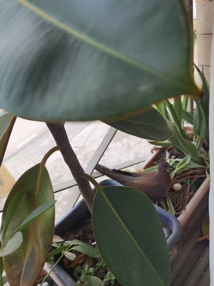 The scene is an outdoor or semi-outdoor area, likely a balcony or windowsill, in the city of Unknown, Unknown. A brown bird, consistent with a dove or pigeon, is observed nesting within a rectangular dark-colored planter. The nest contains one visible white egg positioned next to the bird. The planter holds various plants, including a variegated foliage plant and the distinct large, dark green leaves and a brown stem of a Ficus elastica (rubber plant), one of which occupies the immediate foreground. Beyond the planter, a metal railing and a light-colored paved surface with a white line are visible, suggesting an exterior street or walkway.