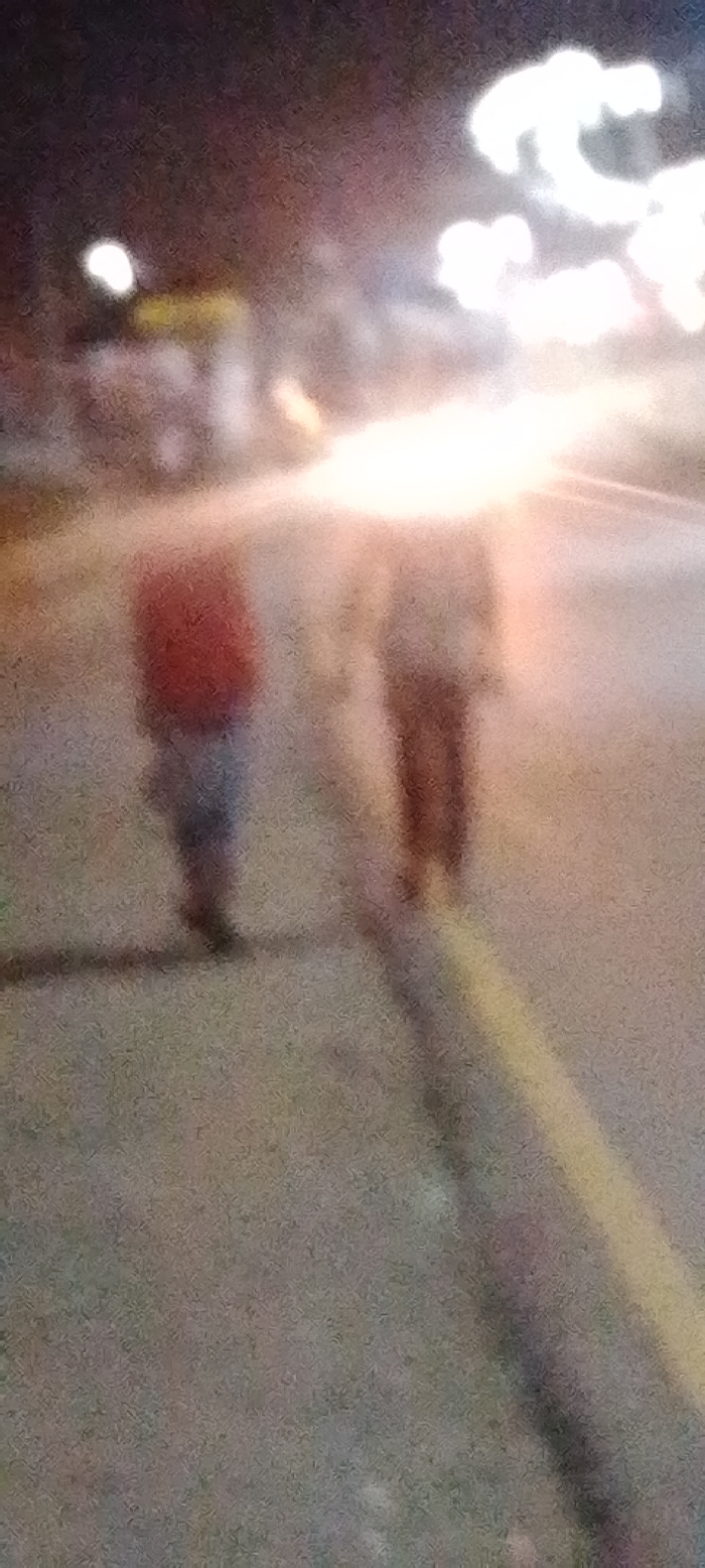 The image depicts an extremely blurred, low-light scene on a roadway at night in the city of Zango-ndaji, Nigeria. Two indistinct human figures are visible. The figure on the left wears a red upper garment and dark lower garment. The figure on the right, positioned slightly further from the camera, wears a lighter-colored upper garment and dark lower garment. Both figures appear to be walking or standing on the paved road, generally moving away from the viewer. A distinct yellow lane marking runs longitudinally along the right side of the road. Multiple intense, blurred light sources, consistent with vehicle headlights, streetlights, or building illumination, dominate the background and midground, creating significant glare and obscuring environmental details. No clear interactions between the figures are discernible. The overall environment is an urban or semi-urban street setting during nighttime hours.