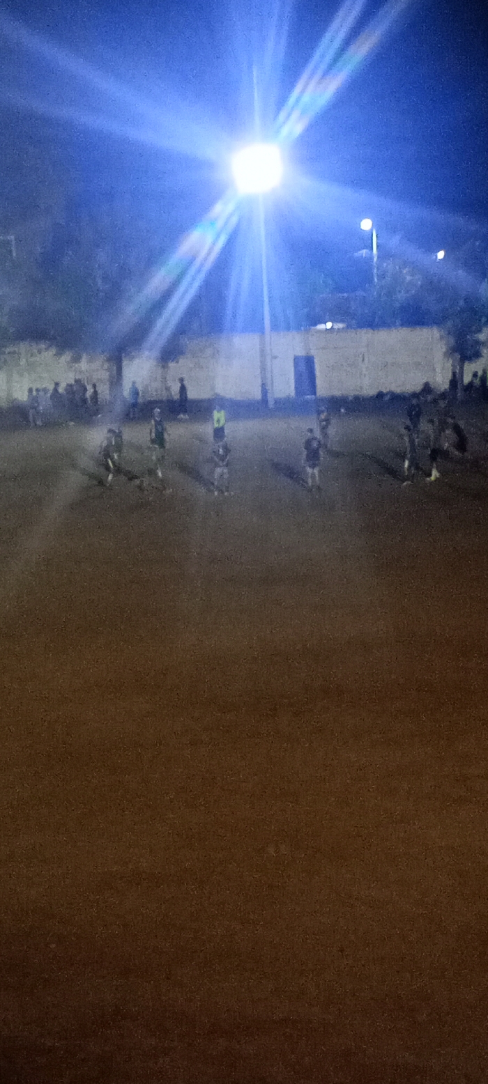A nighttime soccer game is in progress under bright stadium lights. Figures of players are visible on the dirt field, their movements obscured by the light and the image's low resolution. A crowd stands along the perimeter. A wall serves as a backdrop, punctuated by a door. The lighting creates prominent rays of light, dominating the upper portion of the image.