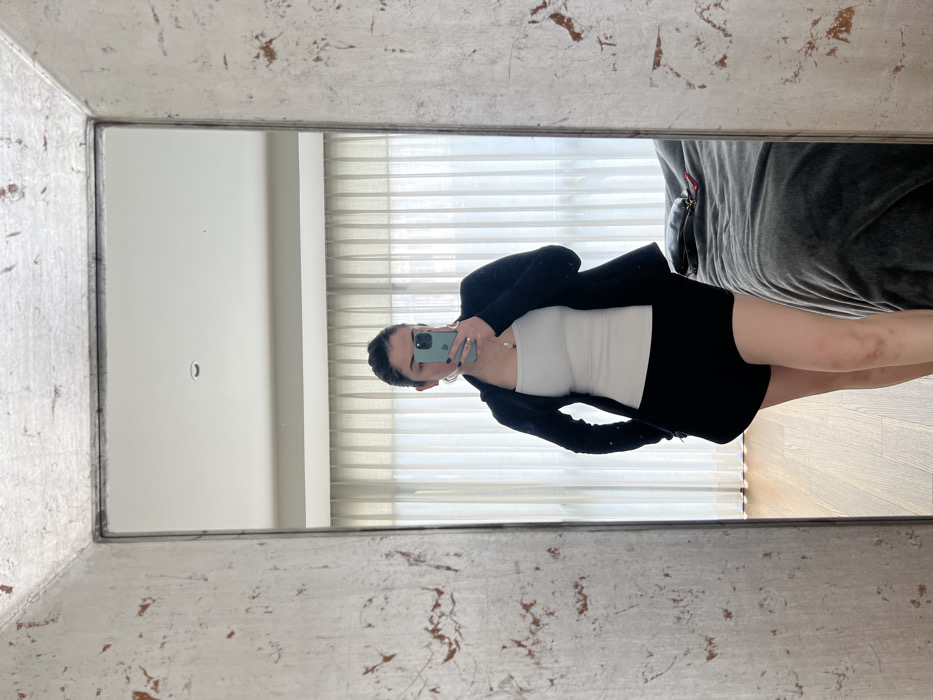 A woman takes a mirror selfie, holding a light-blue phone. She is wearing a white top, a black blazer, and a black mini skirt. Behind her are vertical blinds, a wall, and a gray velvet couch. The floor is light wood. The mirror has an ornate, textured silver frame with brown patches. A small dot is visible on the wall.