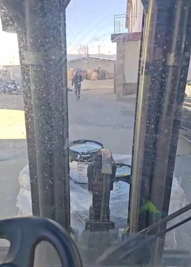 view from inside a forklift moving slowly forward in what appears to be an industrial or storage yard. A large black drum and some bags covered in clear plastic are on the forklift. The driver, wearing black gloves and a red jacket, is operating the vehicle. Through the dirty windshield, a person in dark clothing is walking away in the distance. Other buildings and stacked items are visible in the background under a bright sky. A black SUV is partially visible on the right side. The camera is fixed and stable, capturing the driver’s perspective.