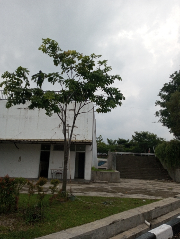 The image depicts an outdoor scene in Cianjur, Indonesia, under an overcast sky. A multi-story white building, appearing somewhat weathered with faint discoloration on its upper facade, occupies the left and central portions. The building's lower level features at least two open doorways. Through one open doorway, a white table and a red chair are visible. A small, leafy deciduous tree with a slender trunk stands centrally in the foreground, partially obscuring the building. On the flat roof of the white building, a single individual is visible, silhouetted against the sky and partially obscured by the tree's foliage. The person, dressed in dark clothing, possibly including a backpack or bulky garment, stands near a metal railing on the roof's edge, with their arms slightly outstretched. Their specific action cannot be definitively determined, but their posture suggests standing or moving. To the right of the building, a wide, dark-colored concrete staircase ascends. This staircase is flanked by concrete structures and dense green foliage, with another person barely discernible at the top of the stairs in the distant background. The foreground features a strip of green grass and low-lying shrubs, bordered by concrete curbs that extend into the lower right of the frame. The ground in front of the building and leading to the stairs is a paved or concrete surface with visible water stains or discoloration.