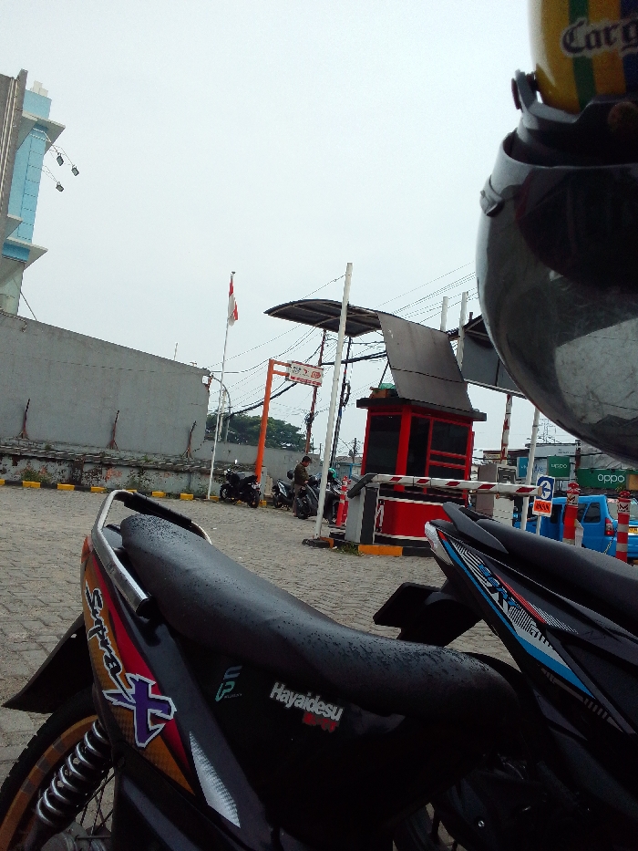 The image depicts an outdoor scene at a toll road entrance or exit in Bogor, Indonesia, identified by the prominent Al-Munawwarah Mosque on the left. In the immediate foreground, the wet black seat and rear section of a Honda Supra X motorcycle are visible on the left, featuring "Supra X" and "Hayaldesu" decals. To its right, the rear fender and seat of another black scooter, with blue, white, and red graphics, are partially visible. The upper right corner is obscured by the top of a black motorcycle helmet, which has a yellow, blue, and green patterned crown with "Cargo" text. The ground is paved with grey interlocking blocks. Centrally, a red and black toll booth structure with a dark, inclined canopy stands, featuring a white and red horizontal barrier arm extended to the left. A male individual in a dark shirt stands near a parked black motorcycle to the left of the barrier, while another person in a light blue helmet is partially visible further right, behind the barrier. Several other motorcycles are parked on the paved area near the booth. In the background to the right of the toll booth, a blue light truck is visible, along with signage including "VESCO" and "OPPO" logos, and a blue circular sign indicating a mandatory right turn. The background on the left features a distinctive tall, light blue and white modern building, identified as the Al-Munawwarah Mosque. A long, grey concrete wall with yellow and black striped posts runs across the mid-background. An Indonesian flag (red and white) flies on a white flagpole between this wall and the toll booth. The sky is uniformly overcast light grey.
