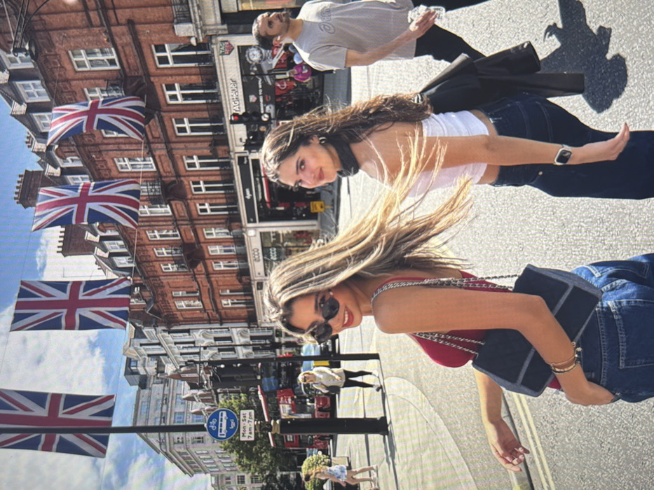 Two women walk along a street in London, England. British flags line the buildings. The first woman wears a red top, jeans, sunglasses, and a shoulder bag. The second woman wears a white top and jeans. A man in a gray shirt walks in the background. Buildings are in the background along with a red double-decker bus.