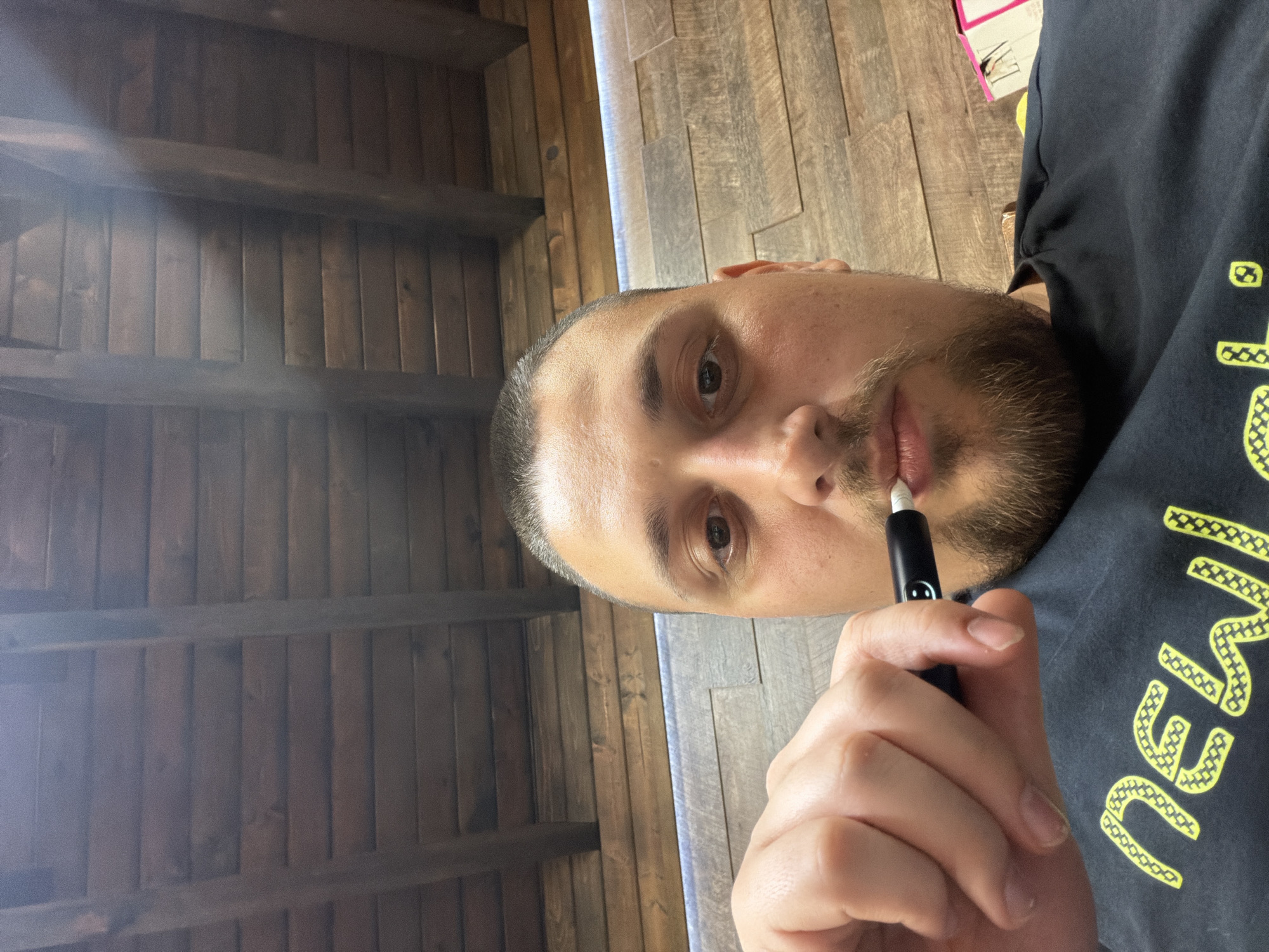 A man with a trimmed head of hair and a short beard holds a black electronic cigarette in his right hand, close to his lips. He is wearing a dark T-shirt with a yellow design on the front. The background consists of a wooden ceiling and a wall panelled with light-colored wood. The photo does not provide any information about the location being Mizia, Bulgaria.