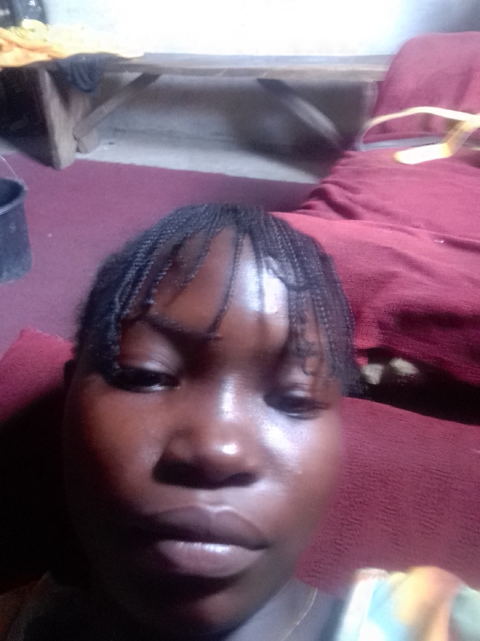 A dark-skinned person with braided hair is positioned in the foreground, occupying most of the frame. A slightly blurred burgundy-colored surface, possibly a cushion or couch, is directly behind the person. In the background, there is a simple wooden shelf with some items on it and a dark bucket. The scene appears to be indoors and dimly lit.