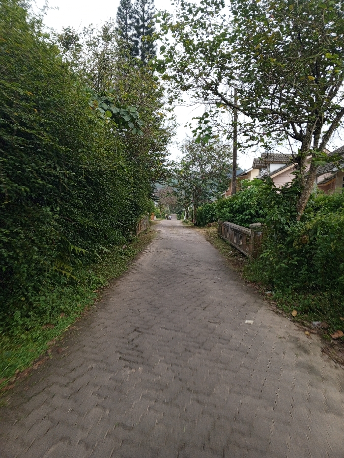 The image displays a downward-sloping, grey brick-paved path in Voa Yeav, Cambodia
