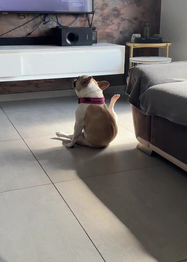 French bulldog sitting on a tiled floor in a living room. The dog is light brown and white, and it's wearing a pink collar. It's sitting with its legs splayed out to the side, looking towards the left. A TV is on in the background, showing a motorcycle race. There is a white media console under the TV, and a couch is visible on the right side of the frame. Sunlight is streaming in through a window, creating shadows on the floor. A portion of a person's leg or arm is visible in the bottom left corner of the shot.