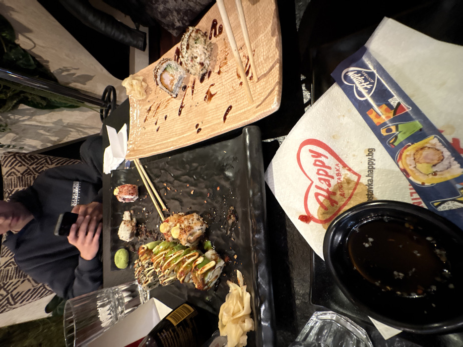- "The image displays an indoor dining scene at a "Happy" restaurant, likely located in an unspecified city in Bulgaria, identified by the "Happy Доставка" (Happy Delivery) branding and website "dostavka" by FM-ApZZw2, licensed under CC BY 4.0