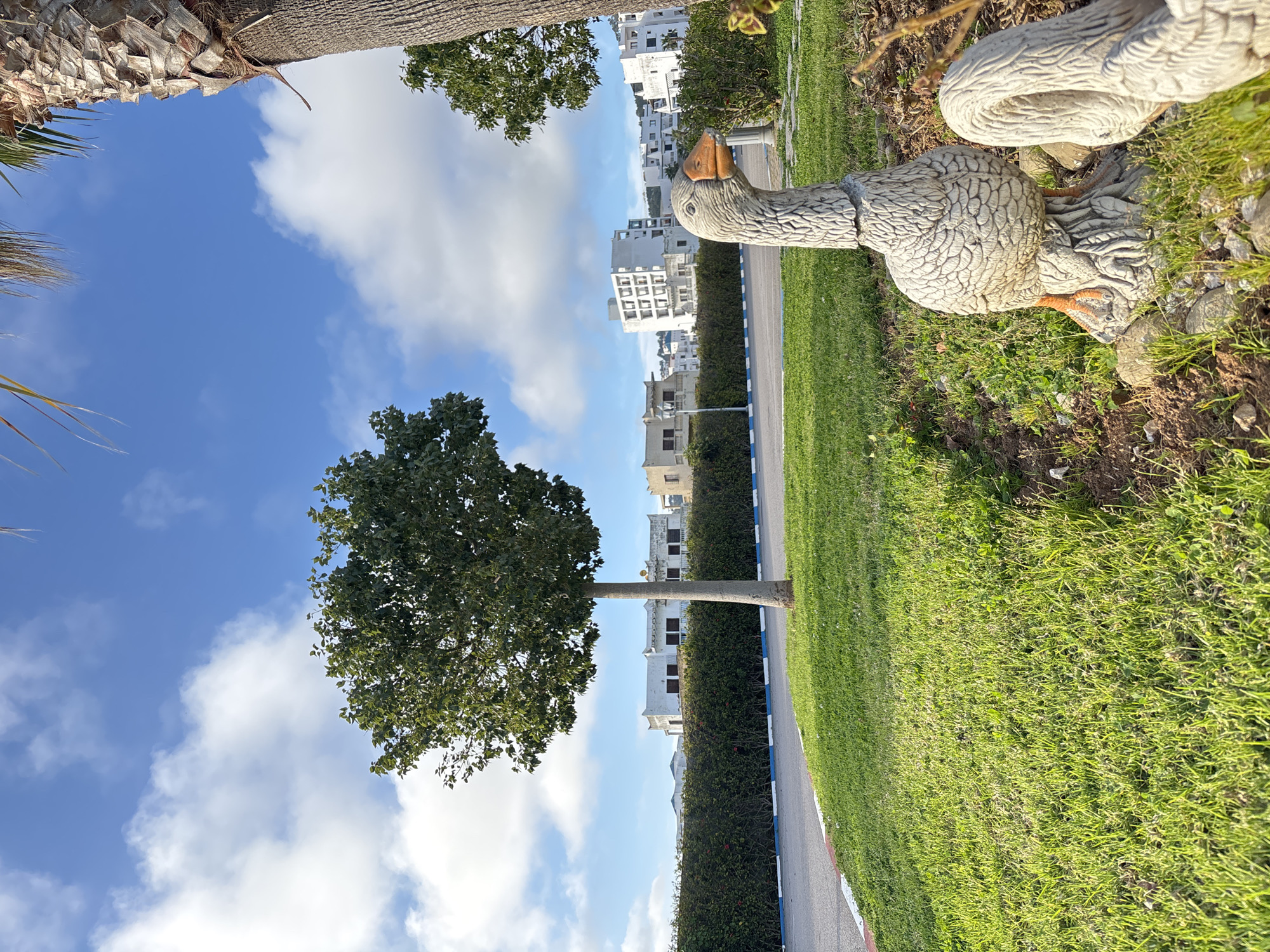 The image displays an outdoor scene in M'Diq, Morocco, under a clear blue sky with dispersed white cumulus clouds. In the foreground, positioned on a patch of vibrant green grass to the right, are two weathered concrete or stone statues resembling geese; one is more prominently featured, facing right with a distinct orange beak. The grass extends to the left, bordering a curved asphalt road marked with white and blue curb paint. A single, deciduous tree with a light-colored trunk and a dense green canopy stands centrally on the left side of the grass, adjacent to the road. A tall, well-maintained green hedge runs parallel to the road further back, separating it from the background. Beyond the hedge, several multi-story white buildings, characteristic of Moroccan architecture with flat roofs and varying window designs, are visible. The upper right portion of the frame is occupied by the textured trunk and fronds of a palm tree. No individuals or specific actions are observed in the scene.