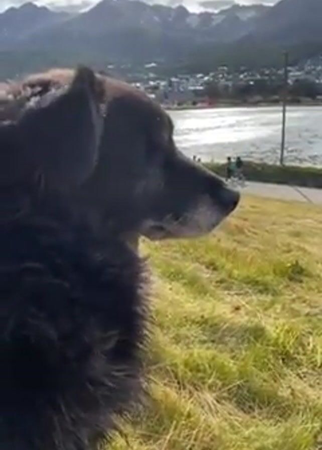 A black dog stands on a grassy hill, gazing to the right. The dog has a long snout, dark eyes, and a bushy coat. In the background, a body of water shimmers in the sunlight, with a walkway running alongside it. People stroll along the walkway. Beyond the water, a town nestles at the foot of a range of mountains under a partly cloudy sky. The sun shines intermittently, creating a mix of light and shadow across the landscape. The camera focuses on the dog, capturing its thoughtful expression against the scenic backdrop.