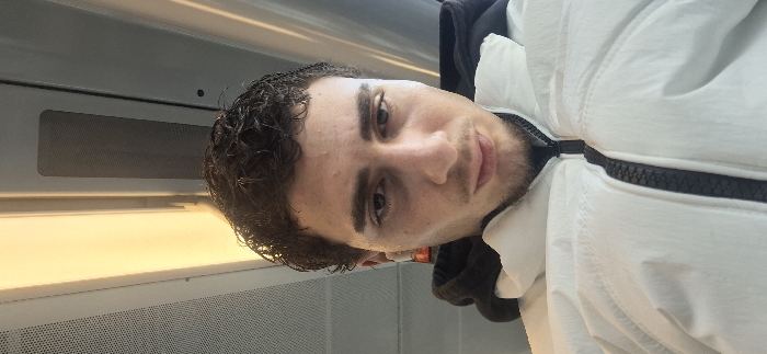 A young adult male is depicted in a close-up, upward-angled selfie, occupying the majority of the frame. He has dark, curly hair, a light stubble beard and mustache, and dark eyes, maintaining direct eye contact with the camera. A white earbud is visible in his right ear. He is wearing a white puffer jacket with a black central zipper, worn over a dark hooded garment. The background consists of the interior ceiling of a vehicle, featuring a prominent, elongated linear light fixture emitting a warm yellow light on the left, and a perforated gray panel on the right. The specific location within Grenoble, France, cannot be determined from the visual evidence present in the image, as the interior elements are generic to public transport vehicles.