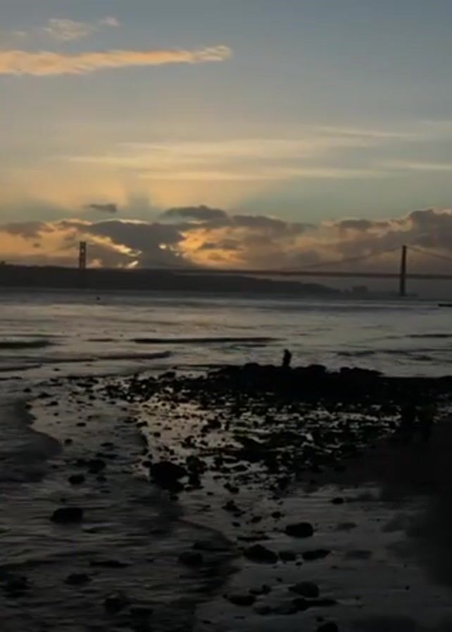 beach at low tide with a view of a suspension bridge in the background. The sky is a mix of light blue, orange, and gray, suggesting either sunrise or sunset. Clouds are partially obscuring the sun, creating a ray-like effect. The tide is out, exposing dark, wet rocks and patches of sand. A few people are visible on the rocky beach, appearing as silhouettes. There is also some vegetation present on the bottom right corner.