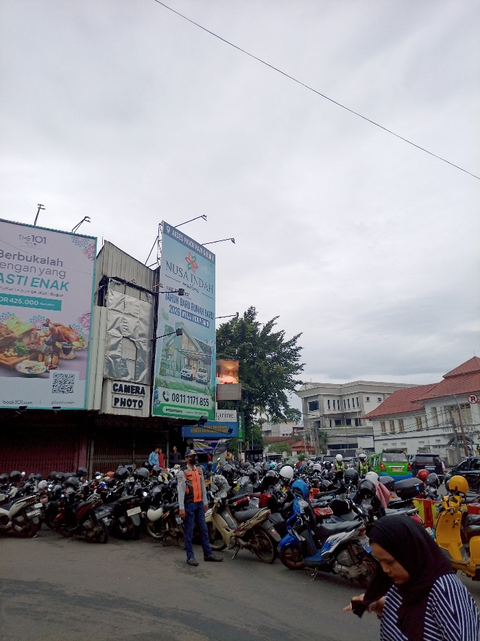 A busy street scene shows parked motorcycles lining the side of the road. Above the shops and motorcycles are large signs advertising "The 101" and "Nusa Indah" properties. "Camera Photo" is visible on a building facade. An individual in an orange vest stands amidst the motorcycles. Buildings are visible in the background under a cloudy sky. The overall impression is of a bustling commercial area.