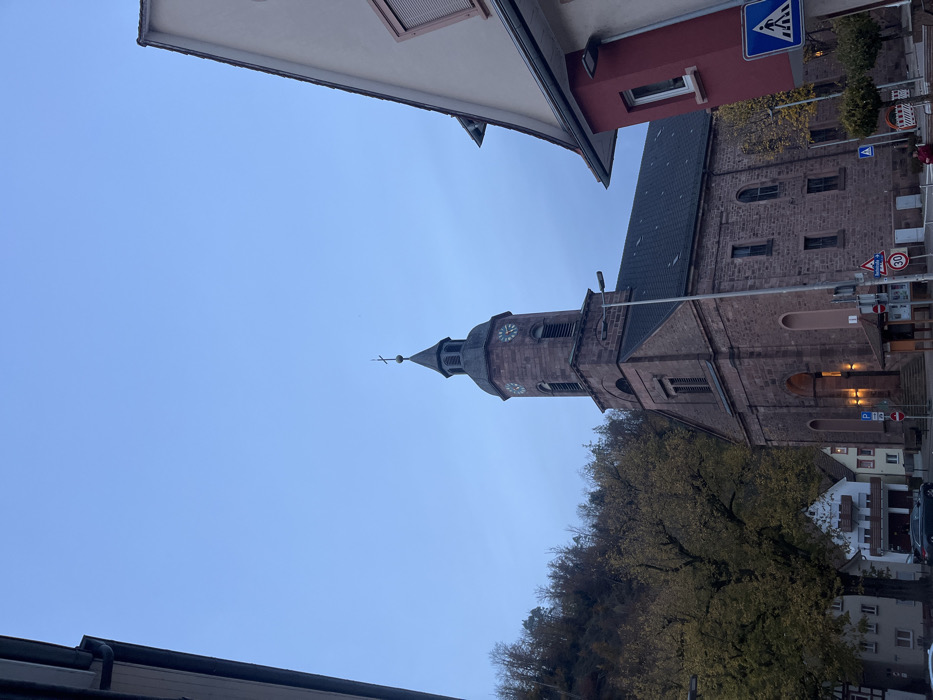 The image displays the St. Johannes Baptist church located in Oppenau, Germany, under an overcast sky, likely during dusk or early morning. The church, constructed from reddish-brown stone, occupies the central and right-mid sections of the frame. It features a prominent square bell tower topped with a dark, pointed spire and a cross. A circular clock face is visible on the tower. The main entrance at street level is illuminated by warm artificial light. To the left of the church, a steep, tree-covered hillside with autumn foliage (yellows and browns) forms the background. In the lower-left foreground, several residential-style buildings with light-colored facades are visible, with a dark sedan parked on the street in front of them. A large deciduous tree with yellow leaves stands between the church and the hillside. On the far right, a portion of a multi-story building with a light beige facade and a reddish-brown lower section is partially visible, framing the scene. The immediate street level in the mid-ground features a paved surface, a lamppost, and various traffic signs, including a blue pedestrian crossing sign, a red and white circular 30 km/h speed limit sign, and parking restriction signs. A single individual is partially visible in the lower right corner, with their lower body obscured and facing away from the camera. The overall lighting is muted and even, consistent with an overcast condition.