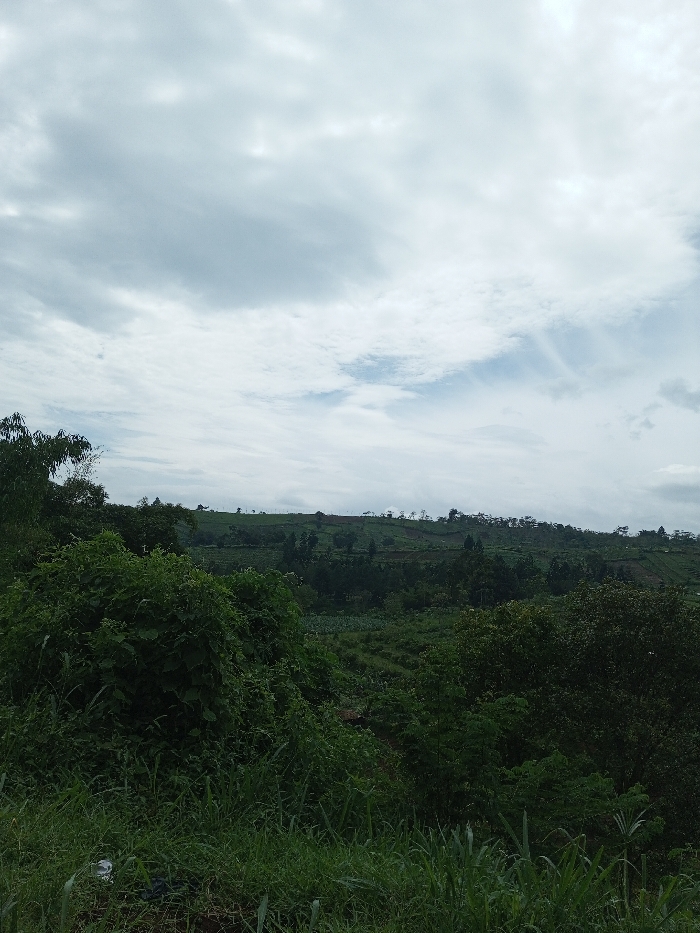 The image captures a panoramic landscape view near Ariyalai, Sri Lanka, under an overcast sky. The foreground features dense, untamed green vegetation, primarily tall grasses and leafy plants, with a small discarded silver-colored object visible on the ground in the lower-left quadrant. The midground transitions into a verdant valley or plain, characterized by a mix of mature trees with dark green foliage and cultivated agricultural fields displaying varying shades of green, suggesting active cultivation. The background reveals a series of distant hills or a plateau, extensively covered in trees and what appear to be terraced agricultural plots ascending the slopes. The sky is largely covered by diffuse, light grey and darker grey clouds, with some lighter patches visible towards the upper right. No individuals, animals, or specific activities are observable within the frame. The lighting is soft and indirect, consistent with a heavily clouded day.