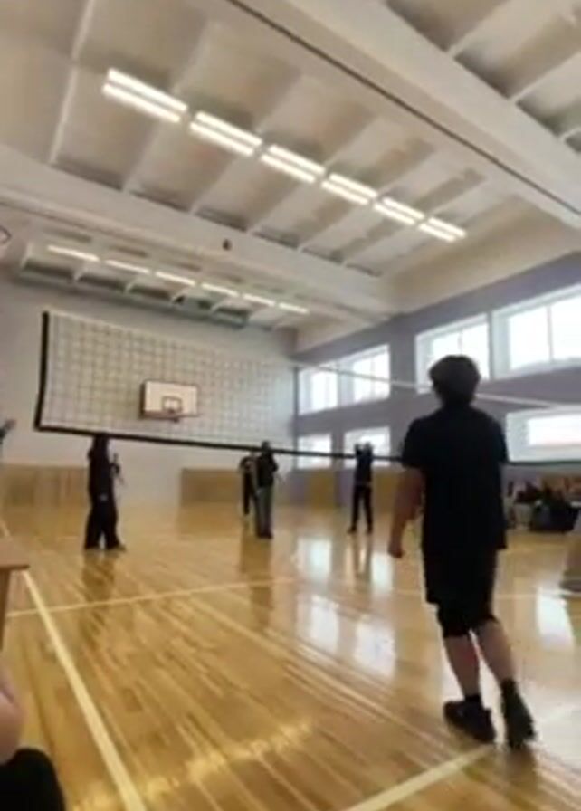 volleyball game taking place in a school gymnasium. Several people stand on both sides of a volleyball net that stretches across the center of the polished wooden floor. The people on one side are wearing dark clothing and appear to be the players. On the right side of the screen, a player in black stands in the foreground with his back to the camera, and there is a group of people in the background, seated in rows along the wall. Overhead lighting fixtures brighten the scene, and a basketball hoop is visible on the far wall above the net.
