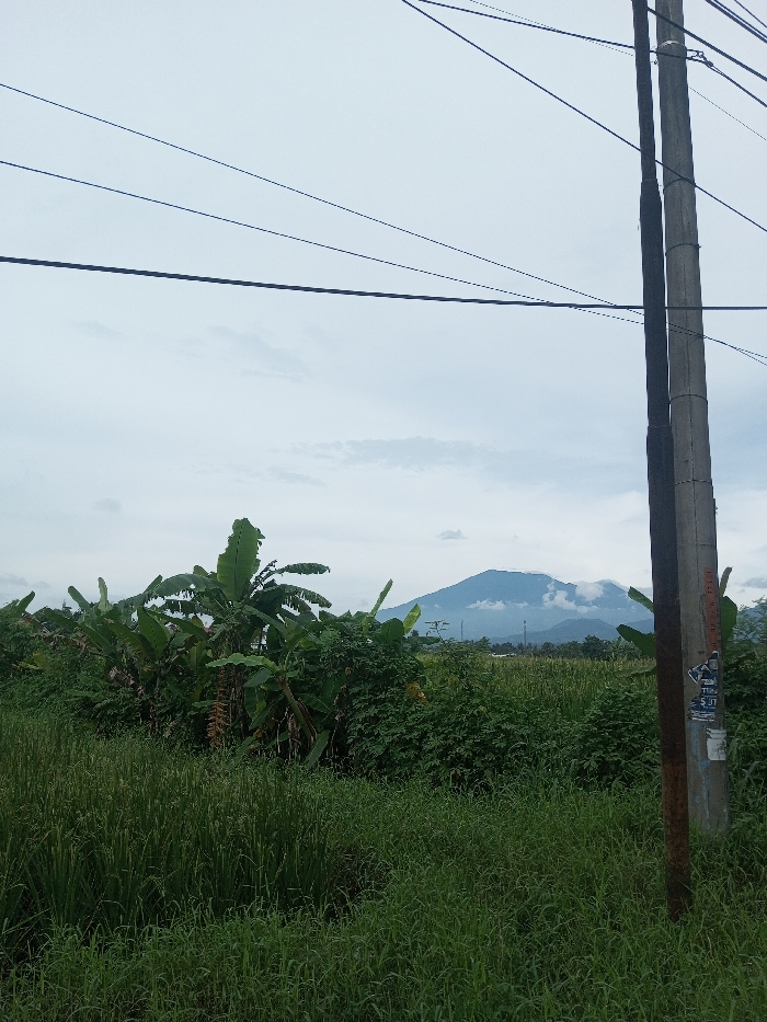 A rural landscape features tall green grass in the foreground, leading to a dense mix of bushes and banana trees. In the distance, a mountain with cloudy peaks rises against a cloudy sky. An electrical pole stands on the right, power lines crisscrossing the upper part of the frame, adding a man-made element to the otherwise natural scene.
