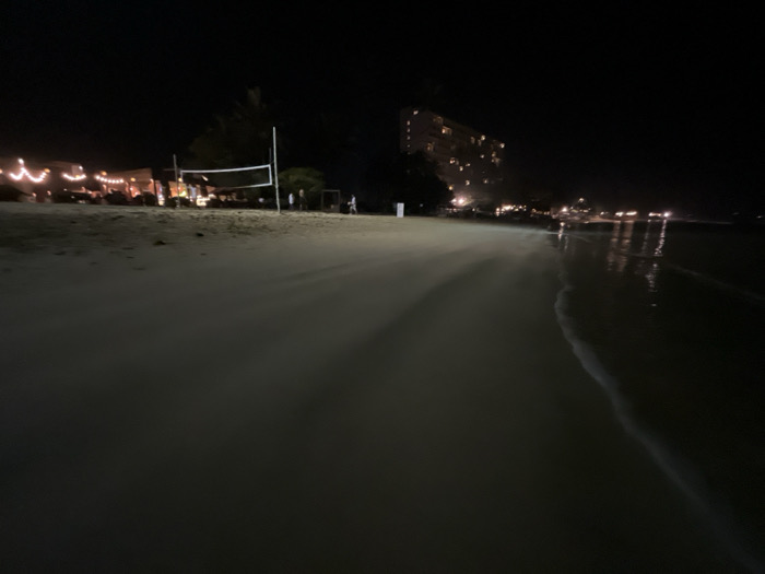 A nighttime beach scene displays faint lights along the coast, illuminating a building with multiple stories in the distance. Closer to the shore, a volleyball net stands near a lit establishment with string lights. The wet sand reflects the faint glow, with the dark ocean edge marked by small waves. The overall image is dimly lit.