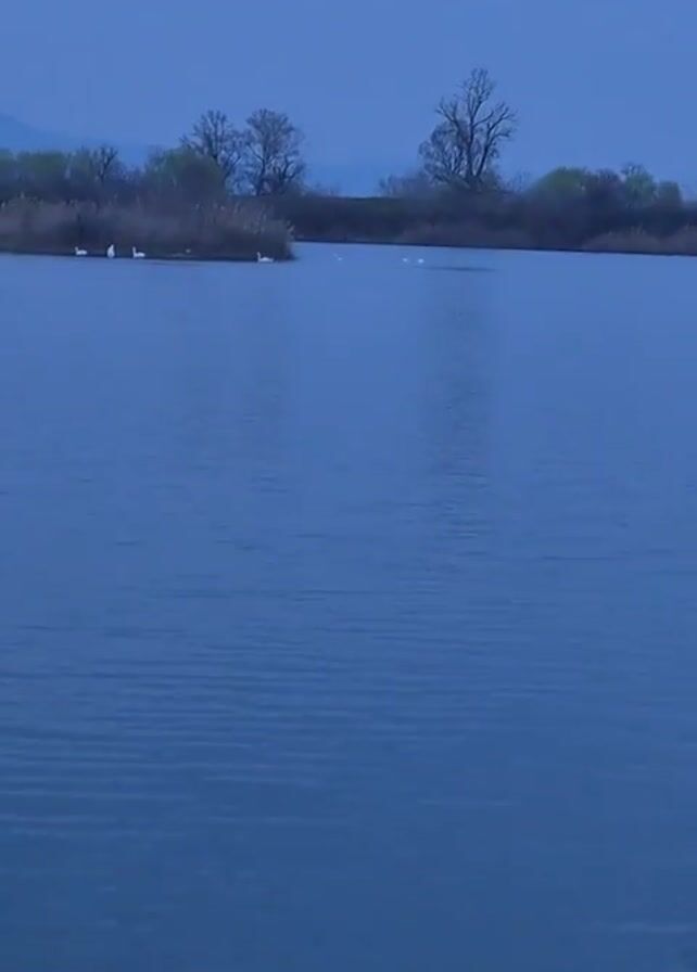 calm lake at dusk. The sky is a deep blue, indicating the lack of direct sunlight. The water reflects the blue sky, giving it a similar color. On a small landmass covered with grass and vegetation, a group of white swans are resting. Several other swans can be seen floating on the water further in the distance. The landscape in the background consists of trees and a slightly elevated horizon line. The overall tone is peaceful and quiet, capturing a serene moment by the lake.