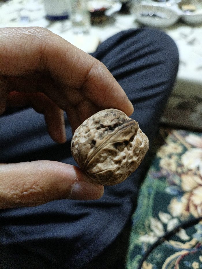 A hand holds a walnut
